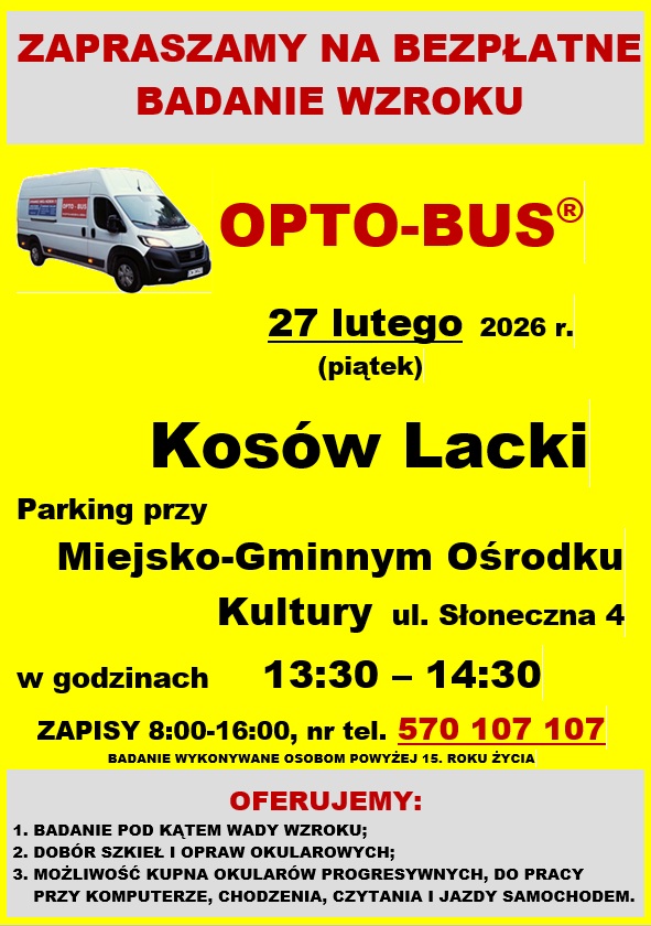 Bezpłatne badania wzroku Zaproszenia 13.02.2026 Szanowni Państwo, z przyjemnością informujemy, że 27 lutego ponownie przeprowadzimy bezpłatne badania wzroku dla mieszkańców. PobierzDrukujShare